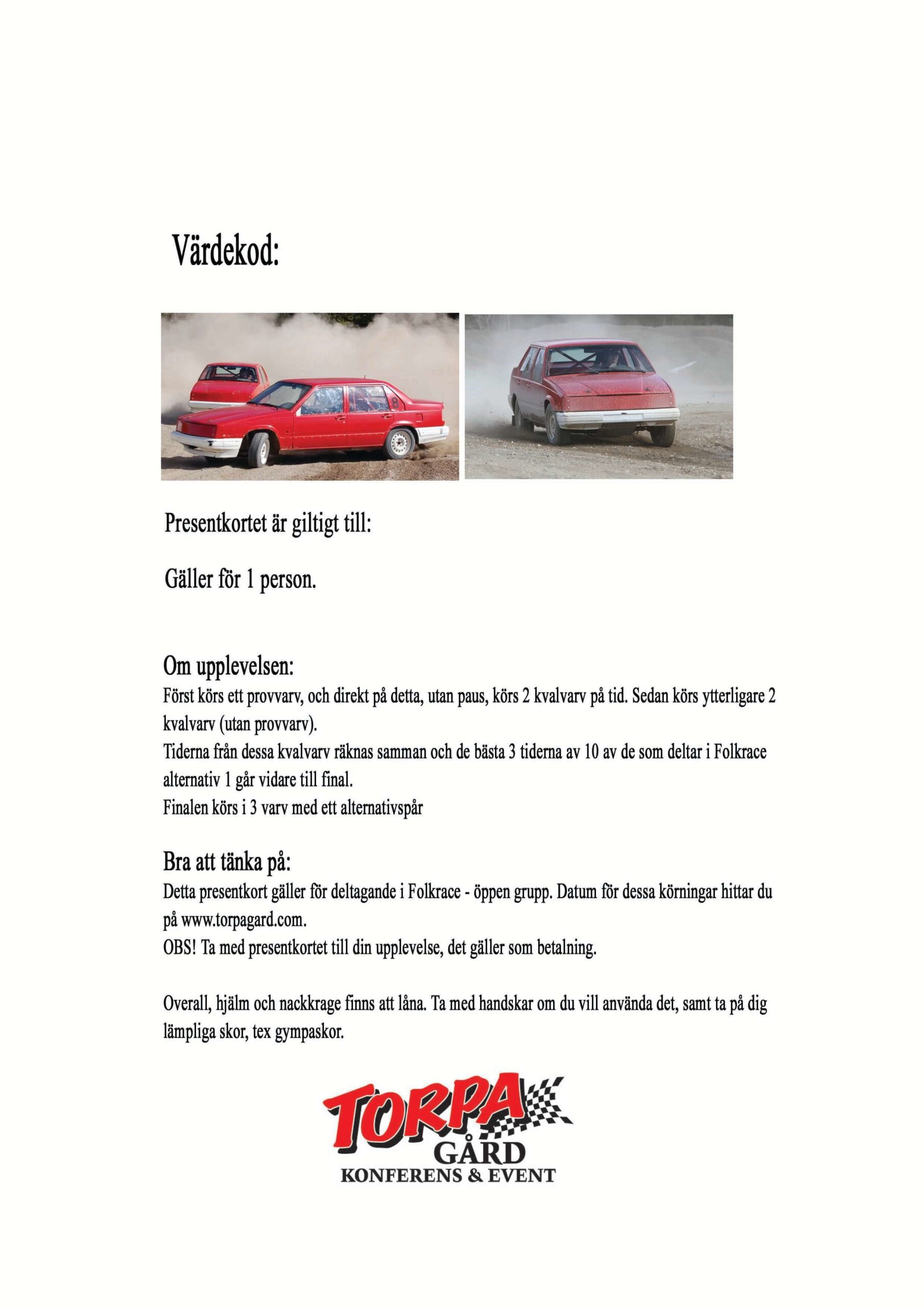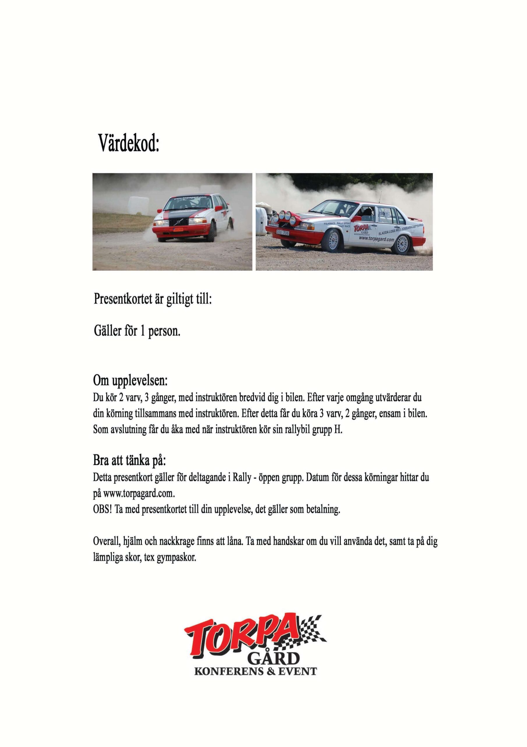 Ge bort ett presentkort på ”Rally öppen grupp”, utan att boka en plats på ett specifikt datum! Presentkortet är giltigt i 1 år.
